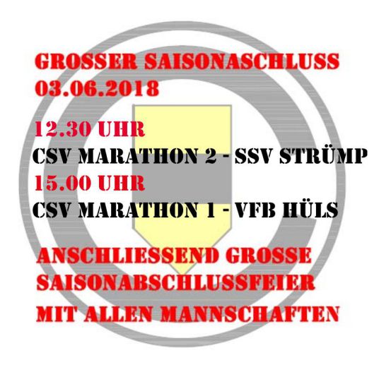 Nächsten Sonntag, den 03.06. verabschiedet sich die Mannschaft mit dem Heimspiel gegen Hüls in die Sommerpause. Im Anschluss an das Spiel, dass um 15 Uhr beginnt, gibt es einen großen Saisonausklang mit allen Mannschaften des CSV. Es hat in dieser Saison eine deutliche Entwicklung innerhalb unseres Vereins gegeben. Es gibt endlich wieder eine Vernetzung zwischen allen Junioren, Damen und Herrenmannschaften...die Csv-Familie lebt!