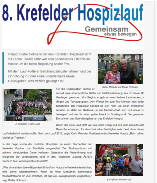 Am kommenden Sonntag, 23. September, findet der „8. Krefelder Hospiz-Lauf“ statt, organisiert vom Stadtsportbund Krefeld (SSB). Kurzentschlossene können sich noch am Lauftag an einem der elf Startpunkte rund um Krefeld anmelden. Die jeweilige Abwicklung ist zügig und problemlos. Helfer tragen die Läufer in die vorliegenden Anmeldelisten ein, die jeweilige Startgebühr beträgt zehn Euro pro Person. Der Hospiz-Lauf ist für einen guten Zweck: Er steht unter dem Motto „gemeinsam etwas bewegen“ - der SSB spendet die Startgebühr komplett an das Hospiz am Blumenplatz.