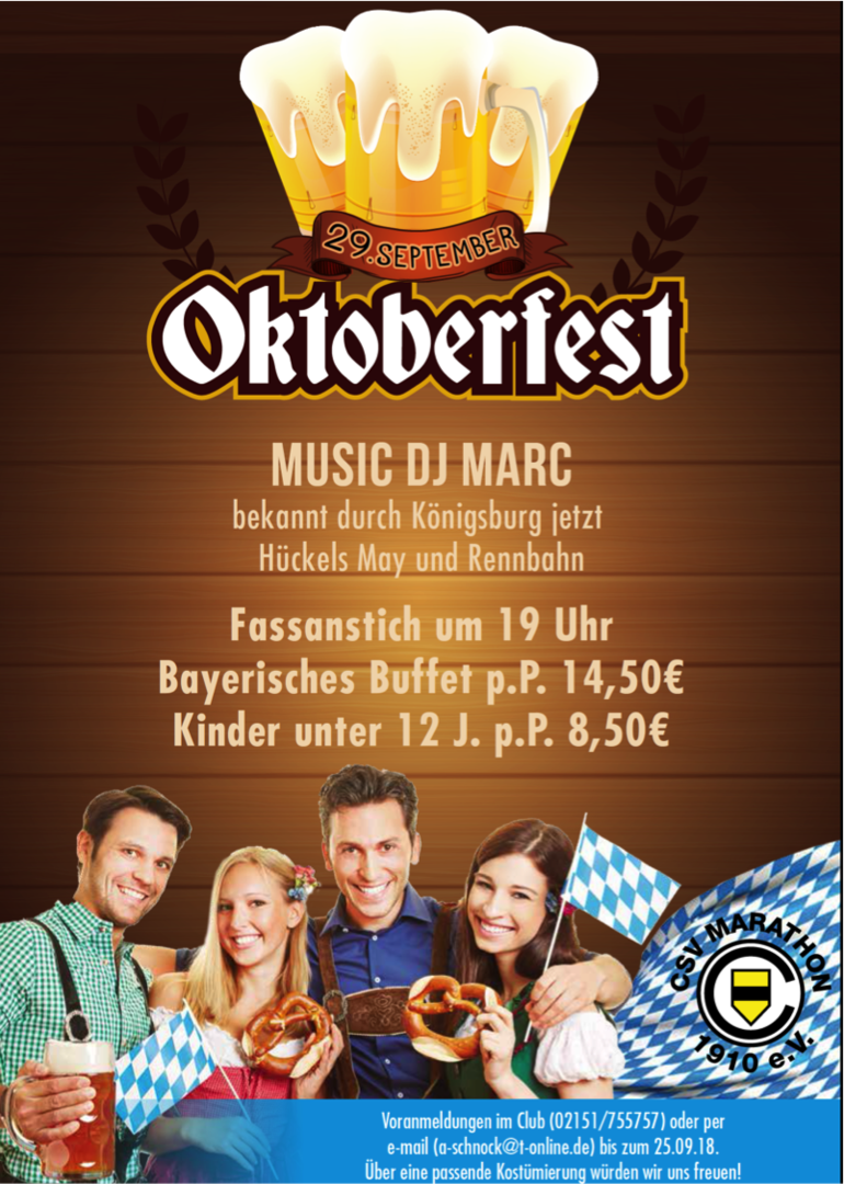 Auch noch für Kurzentschlossene: Am Samstag, den 29. September, feiert die Tennisabteilung das diesjährige Oktoberfest, ab 19:00 im Clubhaus - und würde sich freuen, wenn sich auch viele Mitglieder anderer Abteilungen dort einfinden würden, um ein zünftiges Fest zu feiern ! Also offen für alle Mitglieder des CSV ...