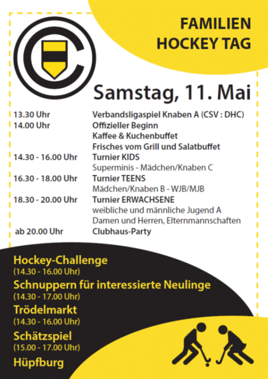 Am Samstag, dem 11. Mai, findet der diesjährige Familien-Hockey-Tag statt, offen für alle - hier das Programm: