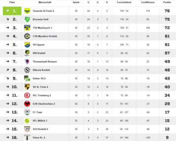 Die Fussballer sind weiterhin auf der Erfolgsspur: Am Wochenende gelang trotz Unterzahl ein Last-minute-Erfolg gegen Teutonia St. Tönis - dadurch wurde die Tabellenführung verteidigt, man liegt trotz einem Spiel weniger mit einem Punkt Vorsprung vor dem TSV Meerbusch. Am nächsten Sonntag steht das Spitzenspiel beim Tabellendritten Borussia Oedt an.