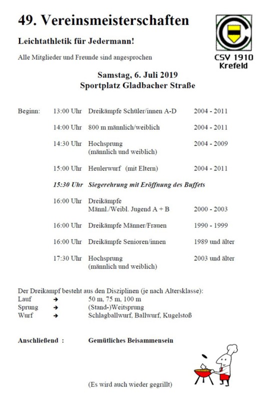 Um 13.00 Uhr starteten die Dreikämpfe für die Jüngeren, um 15:30 Uhr fanden die Rahmenwettkämpfe statt. Danach waren die älteren Jugendlichen und die Senioren an der Reihe. In der Zwischenzeit wurde