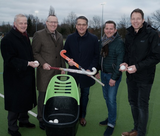 Die Einweihung wurde vorgenommen durch (von links): Michael Rotthoff und Markus Kirschbaum (beide Sparkasse), Markus Böke (Vorsitzender Hockeyabteilung) , Oliver Leist (Präsident CSV Marathon) und Matthias Pasch vom Fachbereich Sport und Sportförderung der Stadt Krefeld.