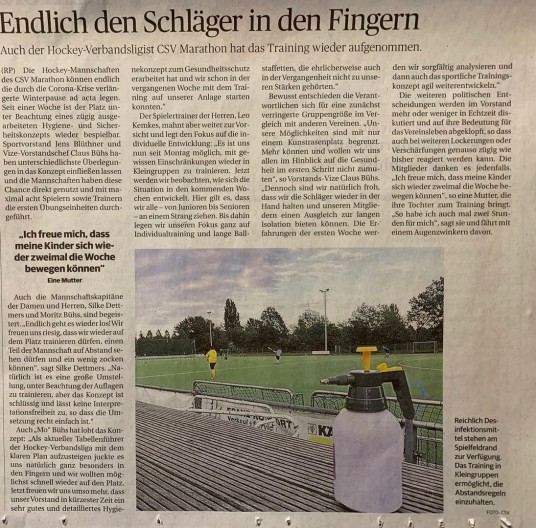 Auch Hockey hat jetzt wieder los gelegt - in dieser Situation natürlich mit vielen Hygiene-Maßnahmen. Dazu gab es heute einen Artikel in der RP: