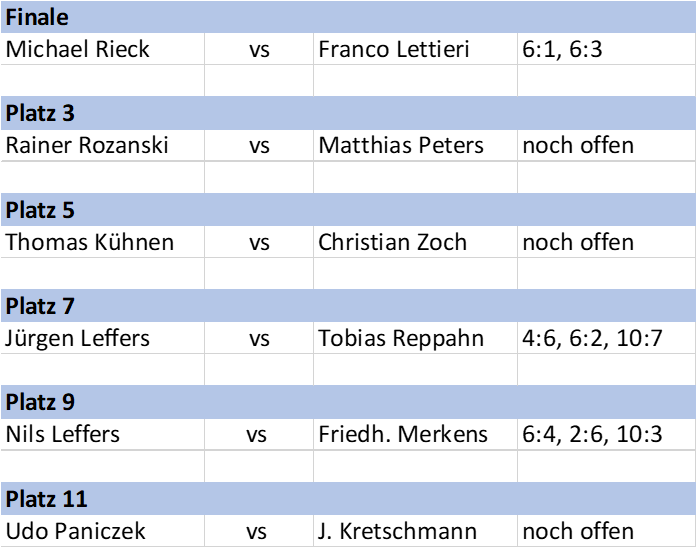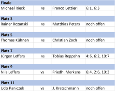 Die Pause wurde im Tennis zu Spielen um die Clubmeisterschaft genutzt: Bei den Damen kam aufgrund zu wenigen Meldungen keine Konkurrenz zusammen, jedoch duellierten sich die Herren - altersunabhängig meldeten sich 22 Spieler, die zunächst in 4 Gruppen gegeneinander spielten. Am letzten Wochenende gab es dann die Finalspiele: Die jeweils beiden Gruppenbesten trugen das Viertelfinale aus, dann ging es in KO Spielen bis zum Finale oder in den Platzierungsspielen weiter.